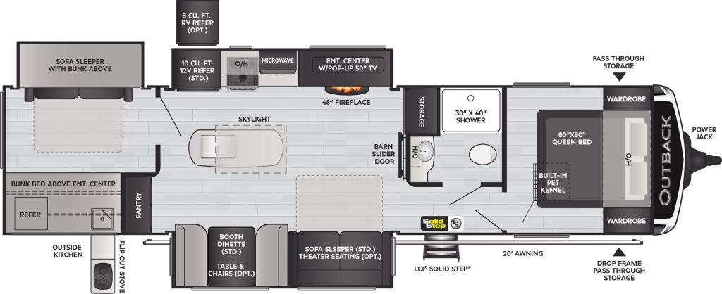 For added convenience, our Outback 340BH includes a full bathroom with a shower, toilet, and sink. And when you’re ready to enjoy the great outdoors, step outside to relax under the awning or cook up a delicious meal in the outdoor kitchen.
